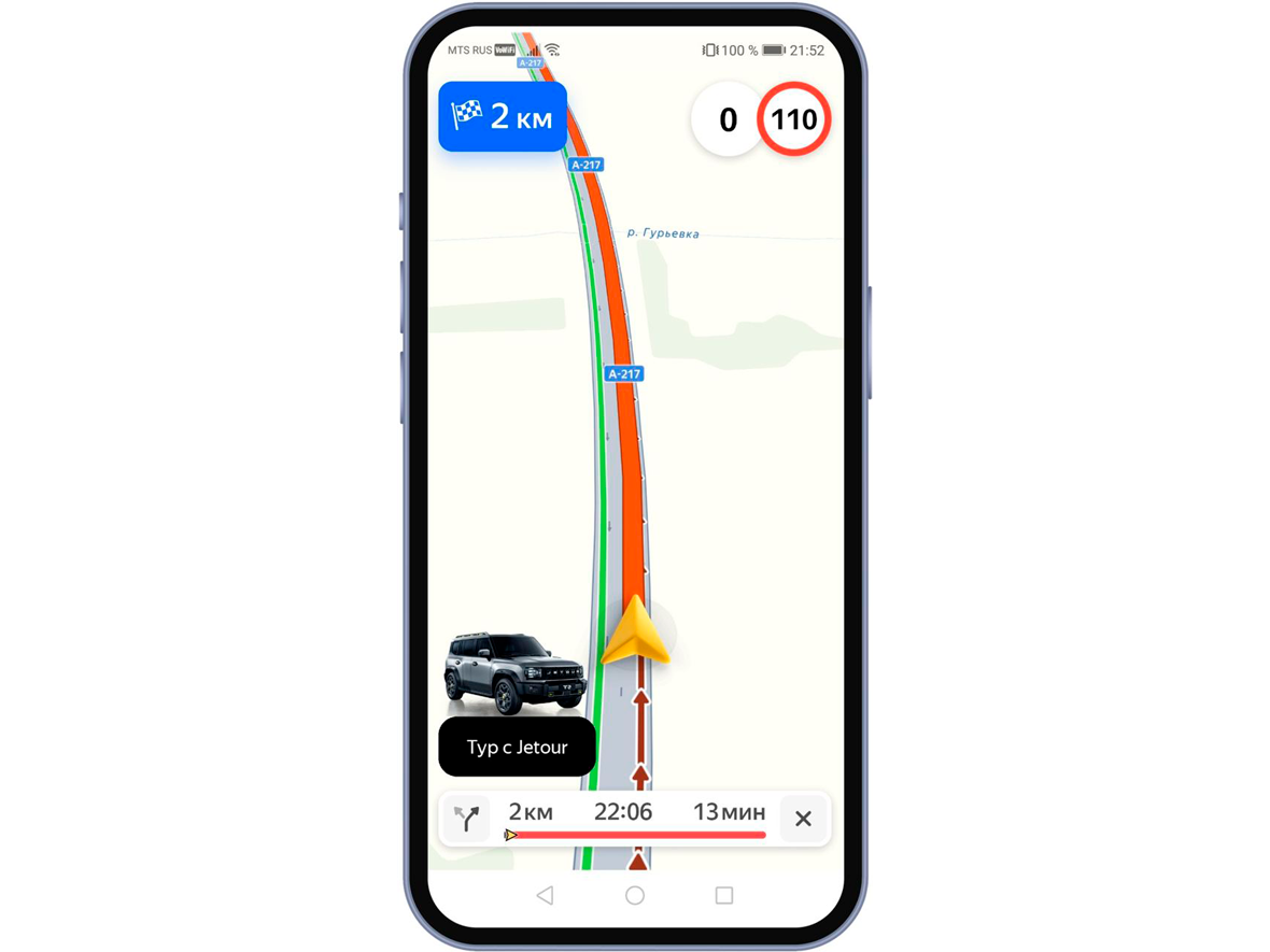 На главном экране Яндекс Навигатора можно увидеть кнопку для перехода на сайт проекта «Тур с JETOUR». Здесь опубликованы полезные советы по путешествиям в различных регионах страны. Также пользователи сервиса могут установить в качестве курсора изображение новейшего внедорожника JETOUR T2. Помимо этого на веб-версии Яндекс Карт есть промо-кнопка, а в пробке пользователи могут увидеть брендированный баннер JETOUR.